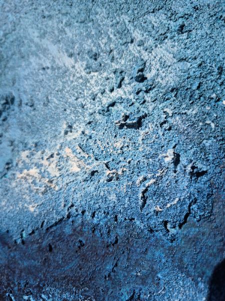 Ved brug af akryl og sandstruktur skabes en tredimensionel overflade, der minder om både fjerne stjernetåger og dramatiske kystlandskaber. Den taktile overflade fanger lyset forskelligt alt efter tidspunktet på dagen, hvilket gør værket levende og evigt foranderligt.