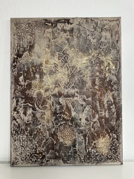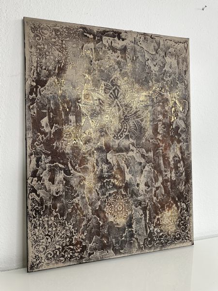 Originalt eksklusivt værk med gyldne jordfarver i forskellige nuancer samt guld der skaber sammenhæng og balance i værket.