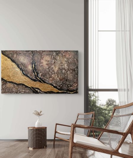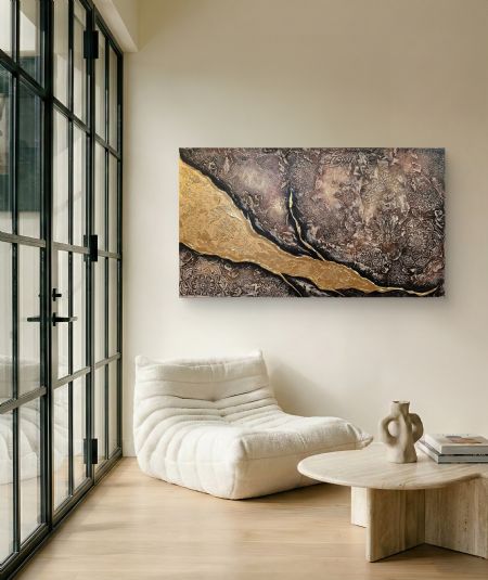 De gyldne nuancer smelter sammen med dybe, jordnære toner og skaber en blød, harmonisk dybde, der inviterer til nærvær.