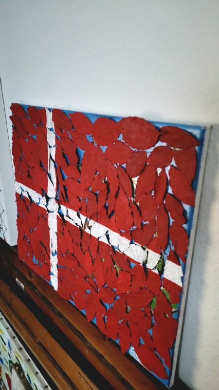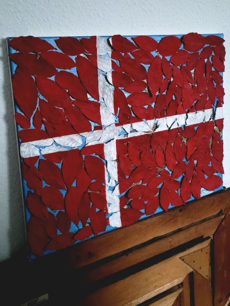 Dannebrog, malet på blad med blå baggrund som er...
