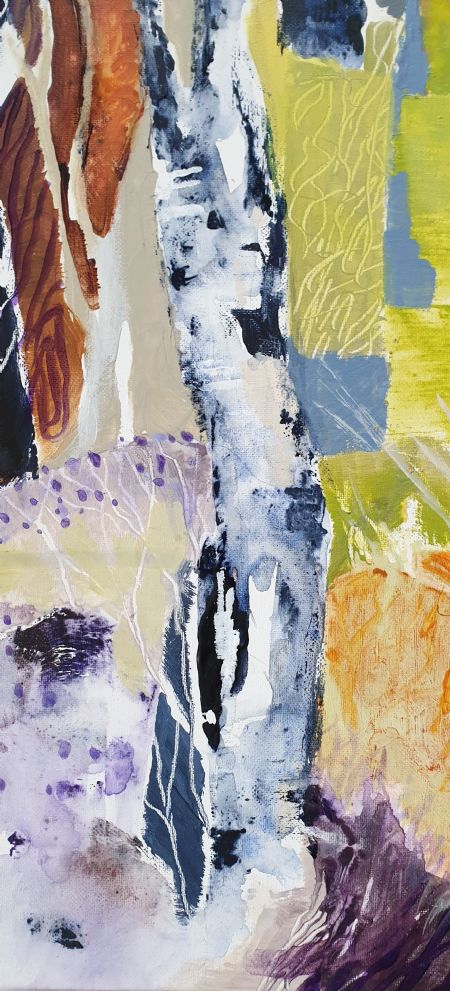 Akryl på lærred. Maleriet har malede sider, så det er derfor velegnet til at hænge uden ramme. Med ophæng. Signeret.
