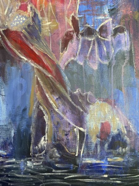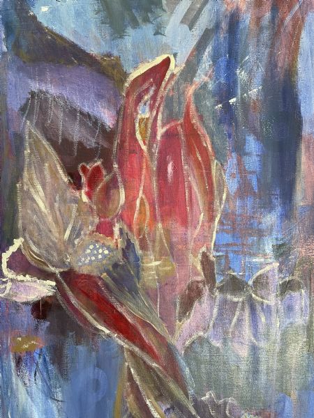 Dette værk er skabt med fokus på kontrasterne mellem det dybe, rolige blå og de intense, varme røde nuancer, der bryder frem som gløder fra mørket. Det er et maleri med masser af dybde og struktur, der ændrer karakter alt efter lysindfaldet i rummet.