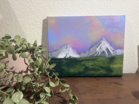 Farverne bevæger sig mellem kølige blå toner og varme rosa nuancer, som skaber en stille stemning.