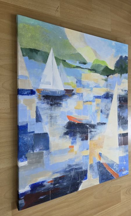 Akryl på lærred. Maleriet har malede sider, så det er derfor velegnet til at hænge uden ramme. Med ophæng. Signeret.