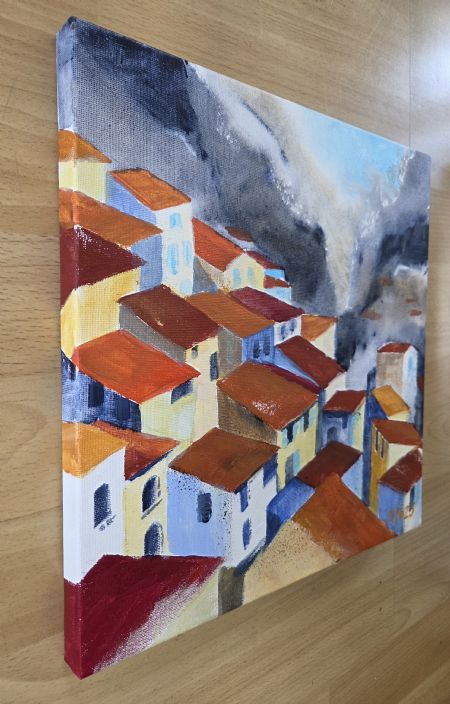 Akryl på lærred. Maleriet har malede sider, så det er derfor velegnet til at hænge uden ramme. Med ophæng. Signeret.
