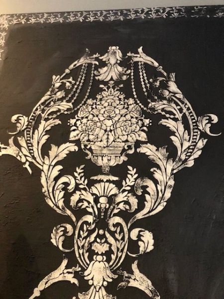 Det hvide mønster er rigt på detaljer og står smukt i kontrast til den mørke baggrund – perfekt til et rum med masser af naturligt lys.
