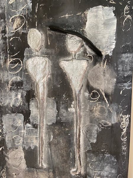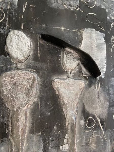 Maleriet er skabt med filler, akrylmaling og bladmetal, hvilket giver det en spændende struktur og dybde. Farvesammensætningen og detaljerne gør det til et unikt, dekorativt stykke kunst, der både fanger blikket og sætter tankerne i gang.