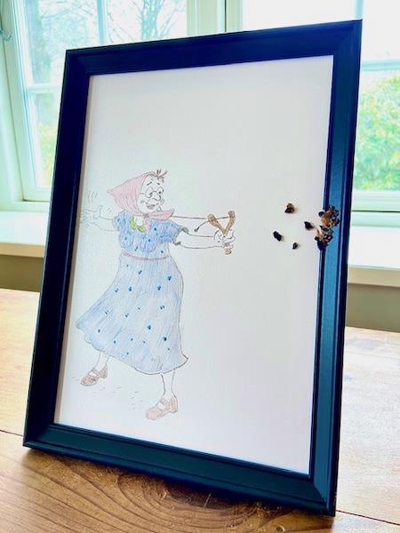 Damen har – måske lidt nysgerrigt, måske lidt for selvsikkert – fået fingrene i en slangebøsse. Et øjebliks leg bliver hurtigt til noget andet, da skuddet rammer ved siden af målet og i stedet efterlader spor dér, hvor det ikke var meningen.