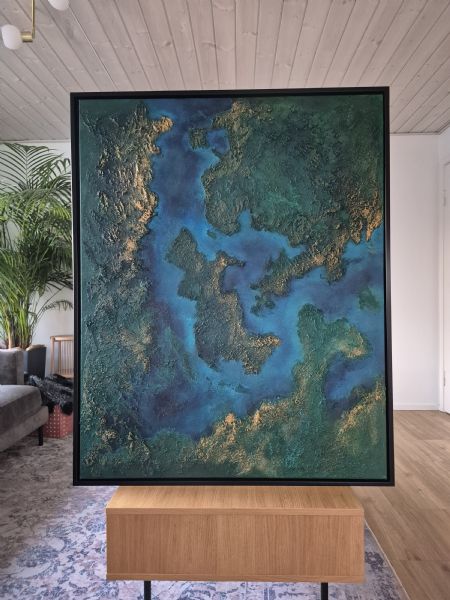 ?Med sin palet af oceaniske blå toner og irret grøn, kontrasteret af varme, sandede teksturer, fungerer maleriet som et beroligende anker i indretningen. Det er det perfekte valg til den kvalitetsbevidste køber, der ønsker kunst, som ikke blot kan ses, men også føles.