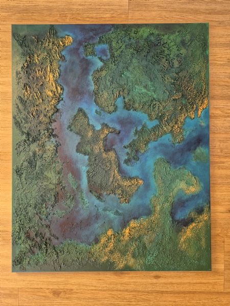 "Earth" er en hyldest til mødet mellem land og hav. Værket skiller sig ud ved sin kraftige relief-effekt, skabt gennem en bevidst brug af strandsand som primært medie. Denne teknik giver maleriet en levende krop og en stoflighed, der ændrer karakter alt efter, hvordan lyset falder i rummet – fra de fine korn i de lyse passager til de rå, klippe-lignende formationer i de mørke dybder.